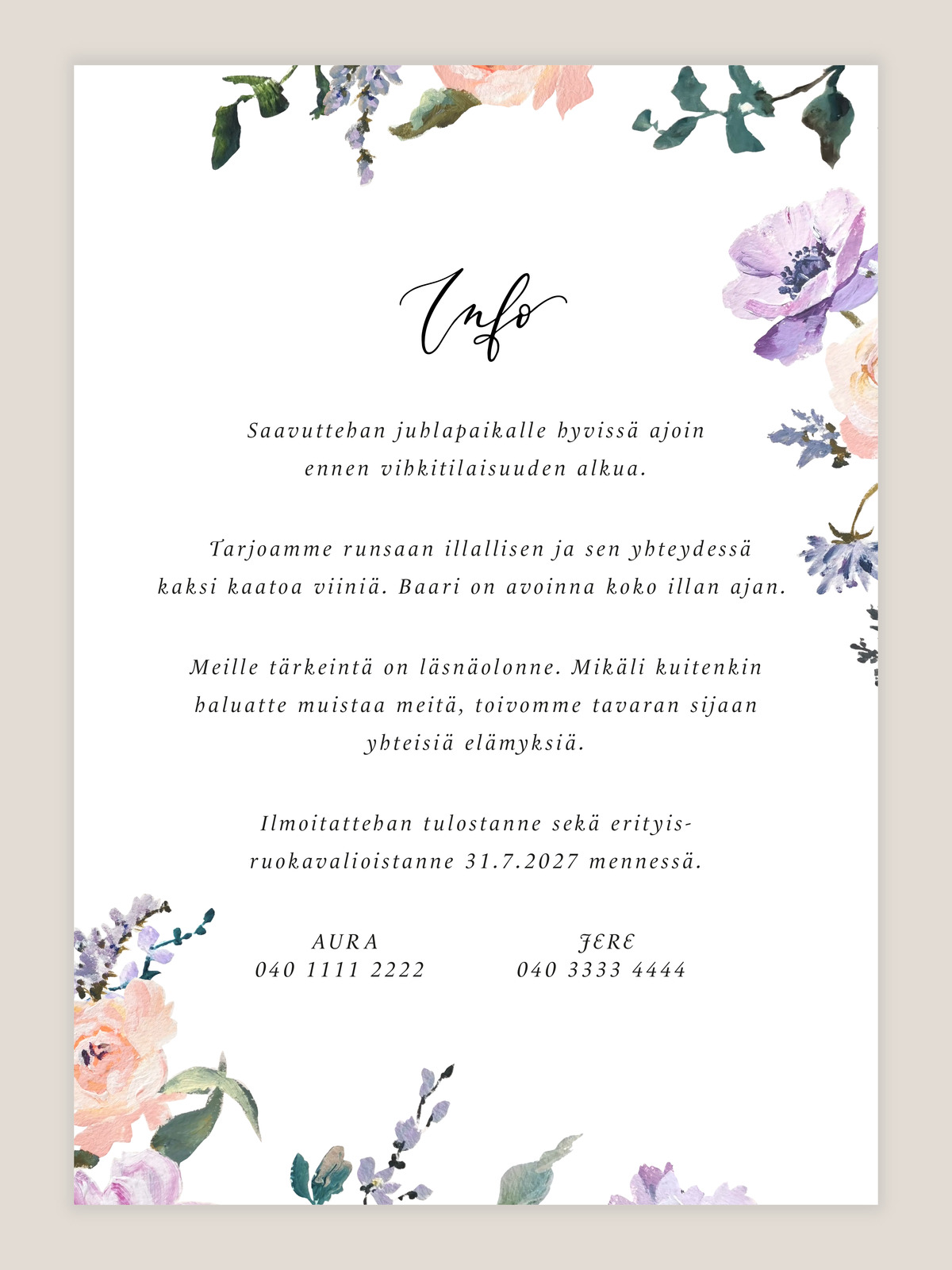 Hääkutsu Kevätniitty on ihana ja helppo valinta modernille hääparille. Täyttäkää vain toivomanne tekstit lomakkeeseen, niin me asettelemme ne valitsemaanne kutsupohjaan ja lähetämme teille digitaalisen koevedoksen sähköpostiin. Hyväksyttyänne vedoksen, lähetämme teille lopullisen tuotteen, joka sisältää digitaalisen kutsun PNG -kuvana sekä painovalmiin PDF -tiedoston. Voitte itse valita haluamanne painopalvelun, mikäli haluatte teettää kutsut paperisiksi.