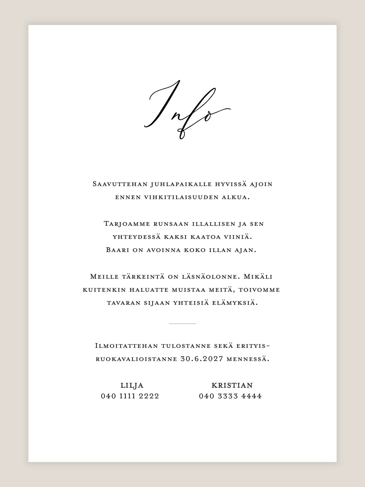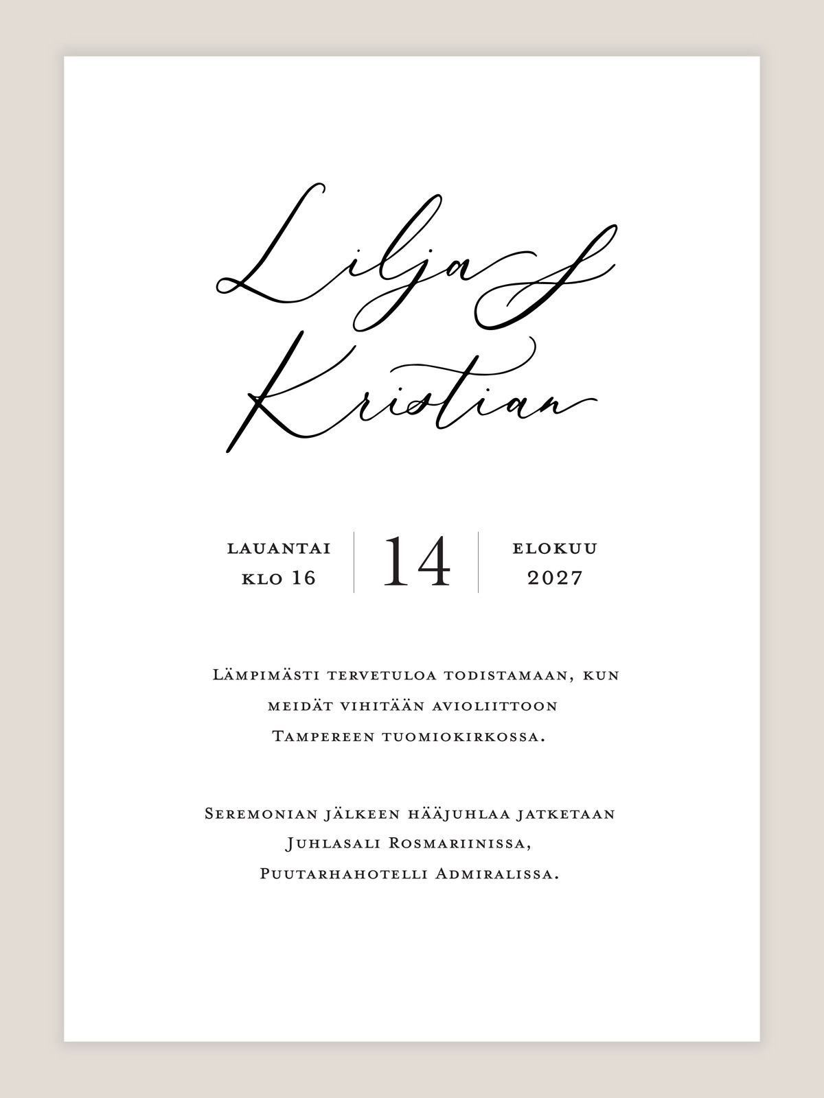 Hääkutsu Klassinen käsin kirjoitetulla kalligrafialla ajattoman tyylikkäisiin häihin! Täyttäkää vain toivomanne tekstit, niin me hoidamme asettelun ja saatte ihanat kutsut mieleenpainuviin häihin.