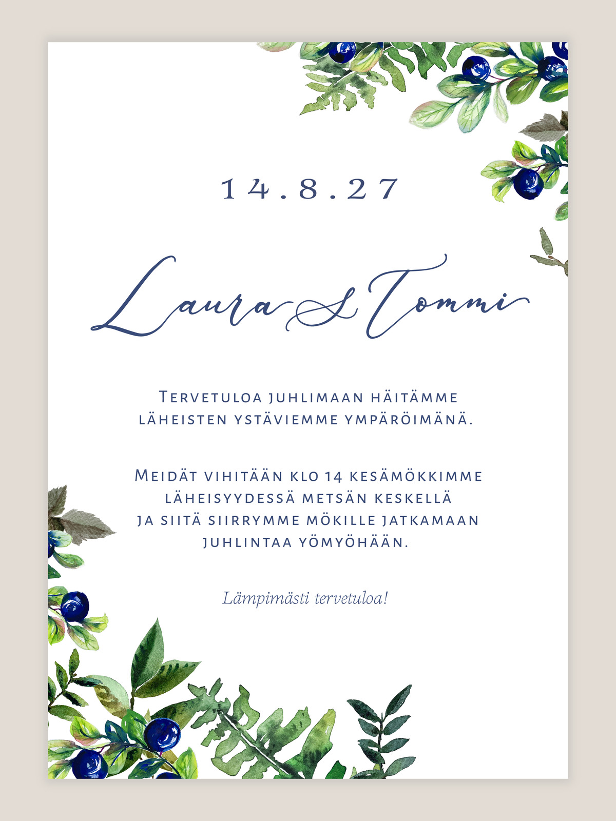 Hääkutsu Mustikka herkullisella vesivärikuvituksella unohtumattomiin häihin! Täyttäkää vain toivomanne tekstit, niin me hoidamme asettelun ja saatte ihanat kutsut mieleenpainuviin häihin.