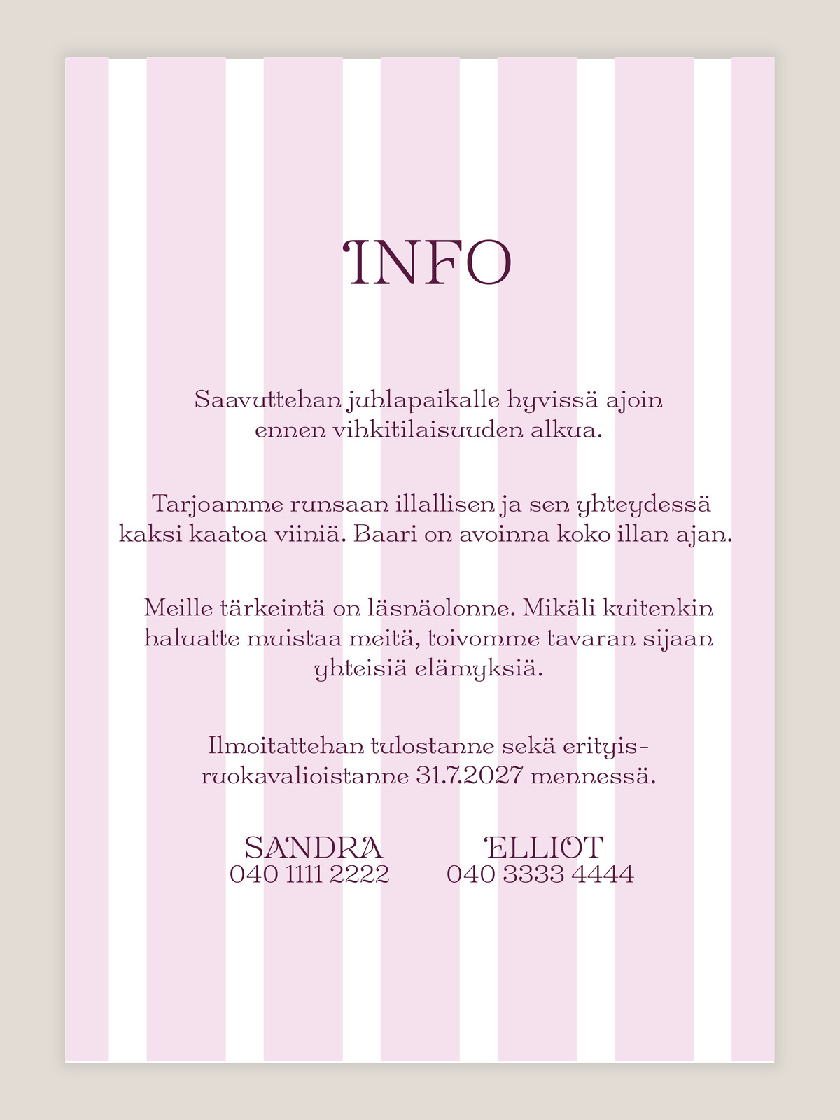 Hääkutsu Raidallinen vaaleanpunainen – ihana ja helppo valinta modernille hääparille. Täyttäkää vain toivomanne tekstit lomakkeeseen, niin me asettelemme ne valitsemaanne kutsupohjaan ja lähetämme teille digitaalisen koevedoksen sähköpostiin. Hyväksyttyänne vedoksen, lähetämme teille lopullisen tuotteen, joka sisältää digitaalisen kutsun PNG -kuvana sekä painovalmiin PDF -tiedoston. Voitte itse valita haluamanne painopalvelun, mikäli haluatte teettää kutsut paperisiksi.