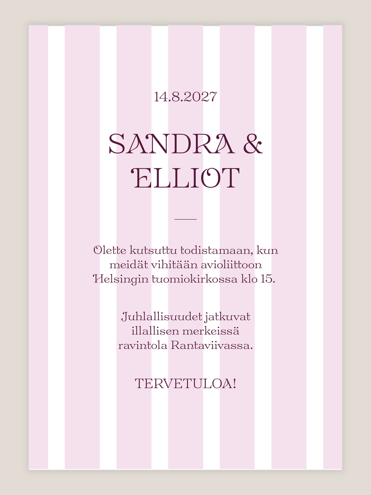 Hääkutsu Raidallinen vaaleanpunainen tyylikkäillä pystyraidoilla, modernille hääparille! Täyttäkää vain toivomanne tekstit, niin me hoidamme asettelun ja saatte ihanat kutsut mieleenpainuviin häihin.