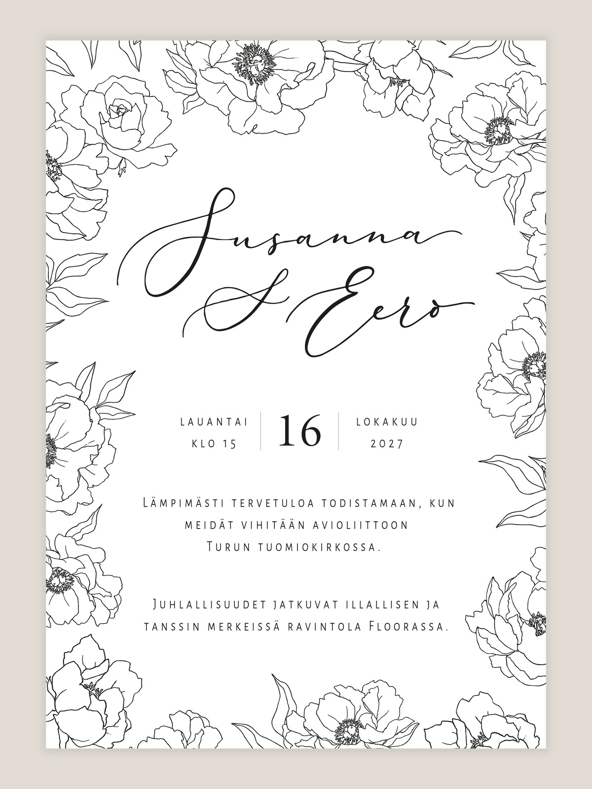 Hääkutsu Viivapiirros kukat kauniilla kukkareunuksella unohtumattomiin häihin! Täyttäkää vain toivomanne tekstit, niin me hoidamme asettelun ja saatte ihanat kutsut mieleenpainuviin häihin.