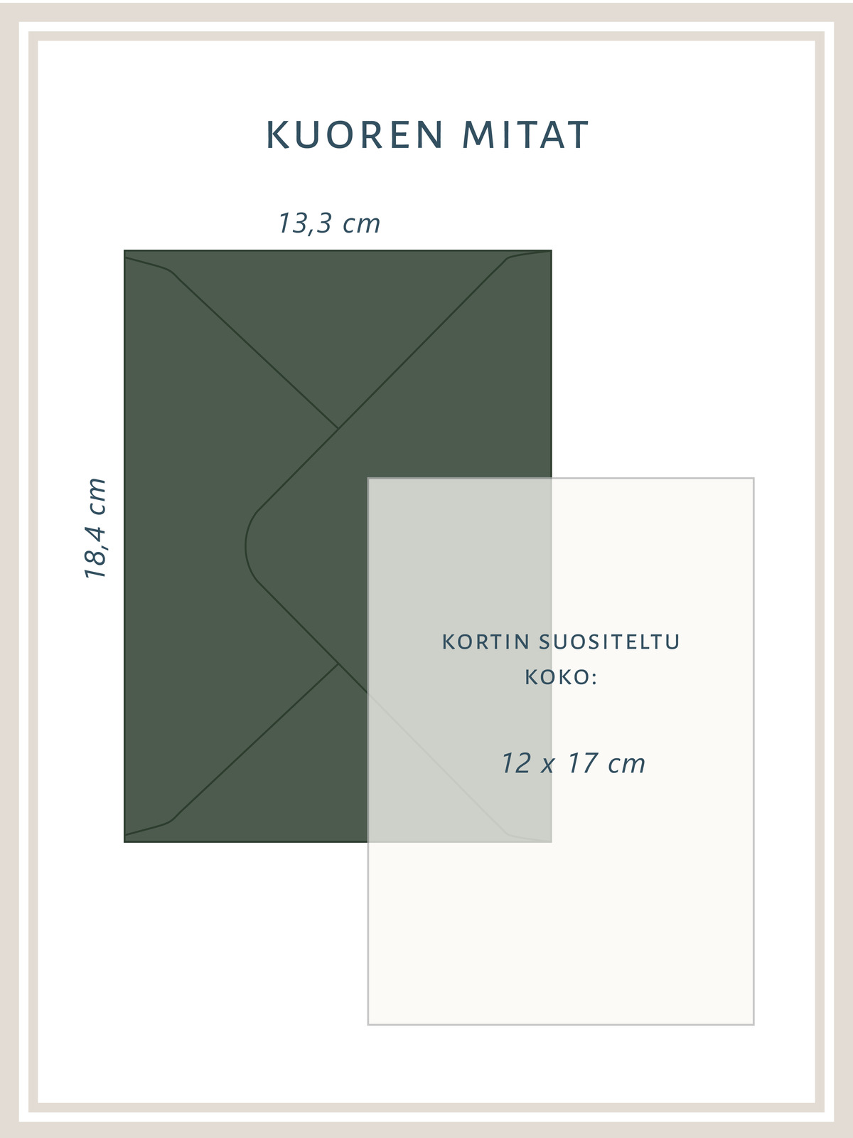 Kirjekuoret Metsä sisältää 10 kpl laadukasta kirjekuorta esimerkiksi kutsuille, onnittelukorteille tai askarteluun. Sävy on kaunis, metsäinen keskitumma vihreä. Kuori sopii parhaiten 17 x 12 cm kokoiselle kortille. Kuoren ulkomitta on 13,3 x 18,4 cm. Kokeile yhdistää ihanaan kirjekuoren sisäpaperiin!