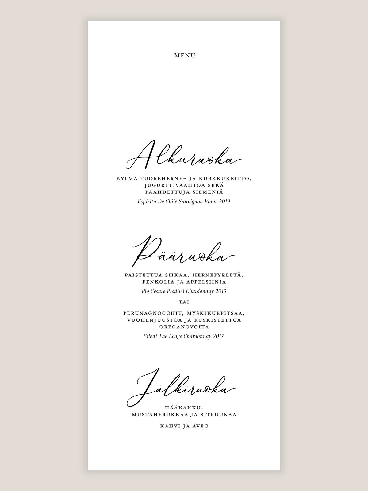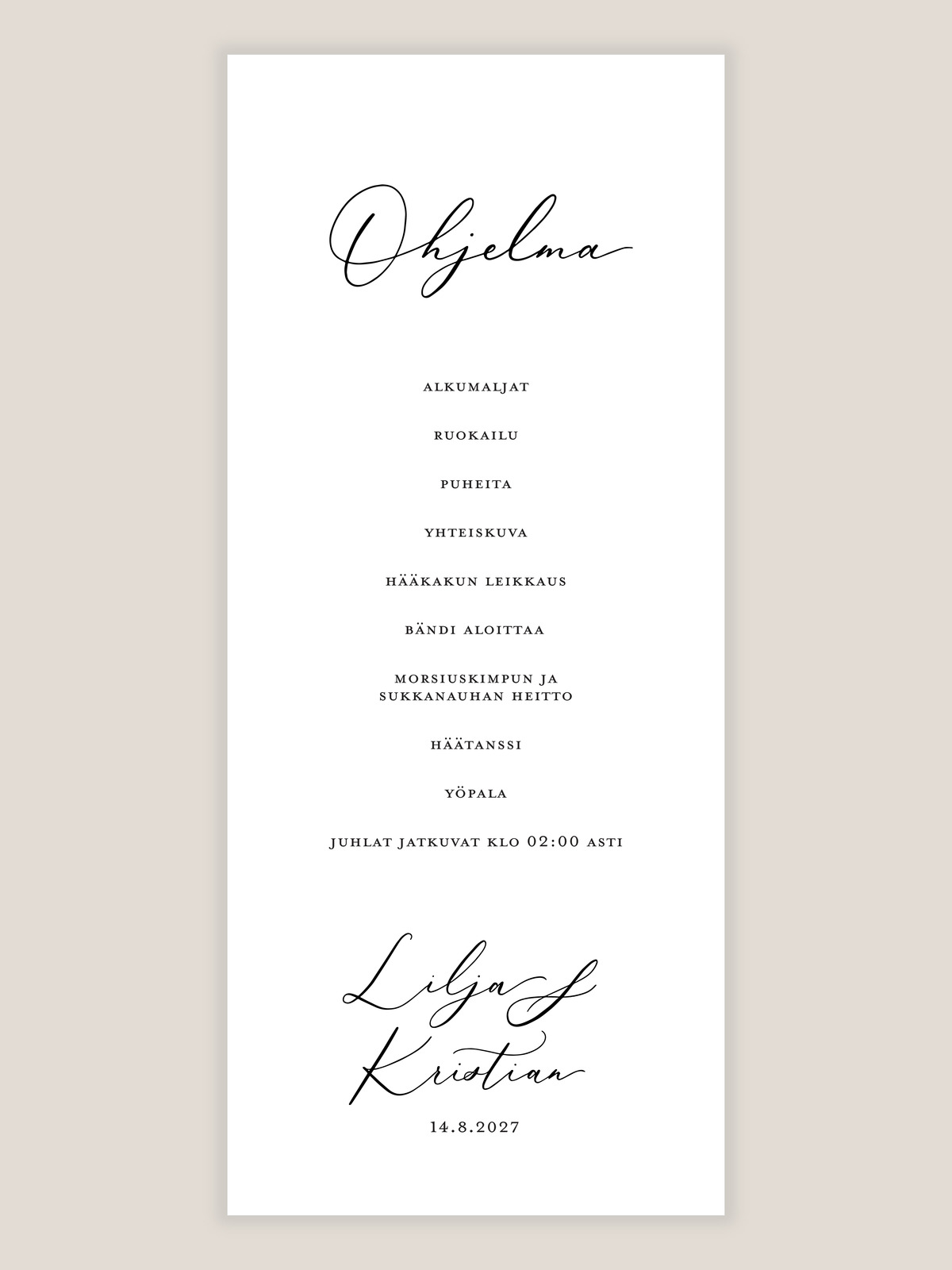 Menu- ja ohjelmakortti Klassinen tyylikkäällä kalligrafialla on täydellinen lisä hääjuhlan kattaukseen! Täyttäkää vain toivomanne tekstit lomakkeeseen niin me asettelemme ne puolestanne ja lähetämme valmiin tiedoston sähköpostiinne. Painattakaa kortit paperille valitsemallanne painotalolla lähellä teitä!