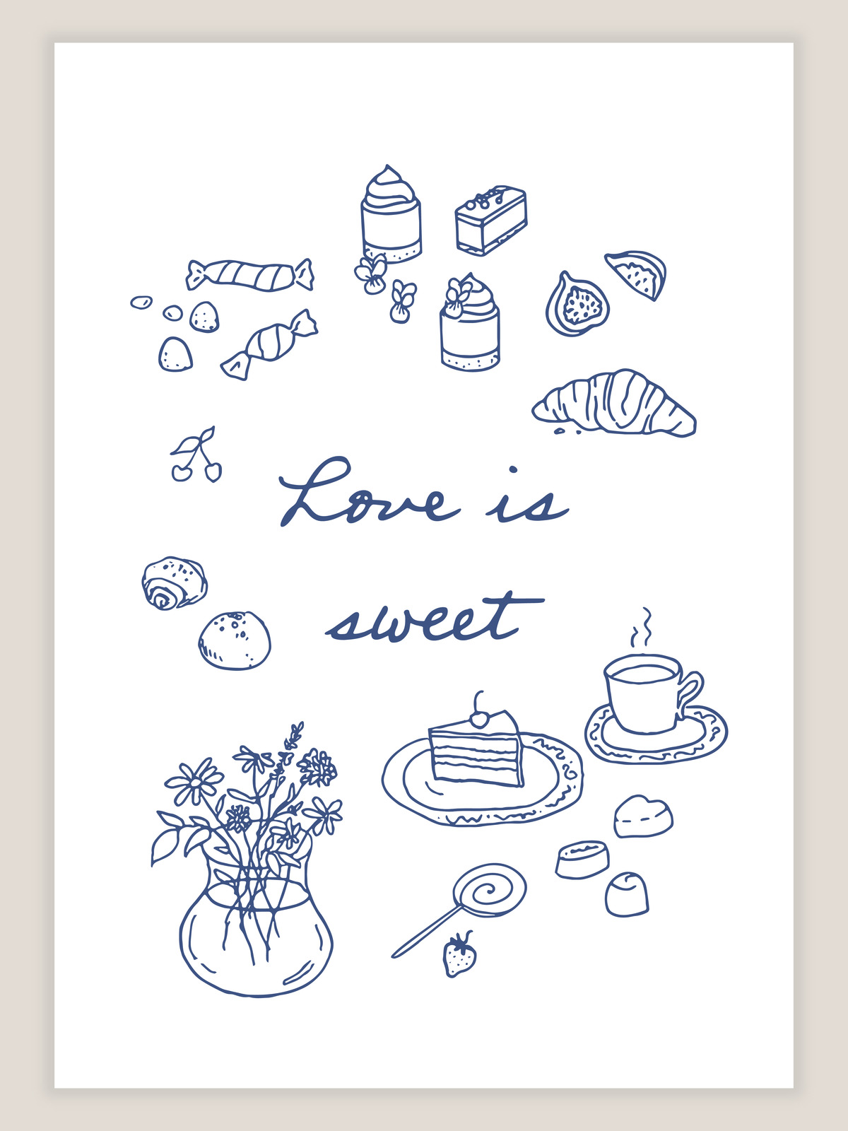 Romanttinen viivapiirros Love is sweet on kaunis printti juhlatilan koristeluun esimerkiksi jälkiruokapöytään tai karkkibuffettiin! Voit ladata A4-kokoisen tiedoston heti koneellesi ja joko tulostaa sen itse, tai käyttää valitsemaasi painotaloa. Katso myös muut saman teeman tuotteet!